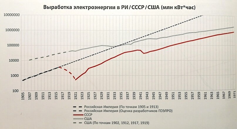И в общем то создается впечатление, что к 1930 году и без революции достигли бы 10 млрд кВтч. При том первая районная ТЭС появилась еще в Империи, магистральный путь был в общем то всем понятен.